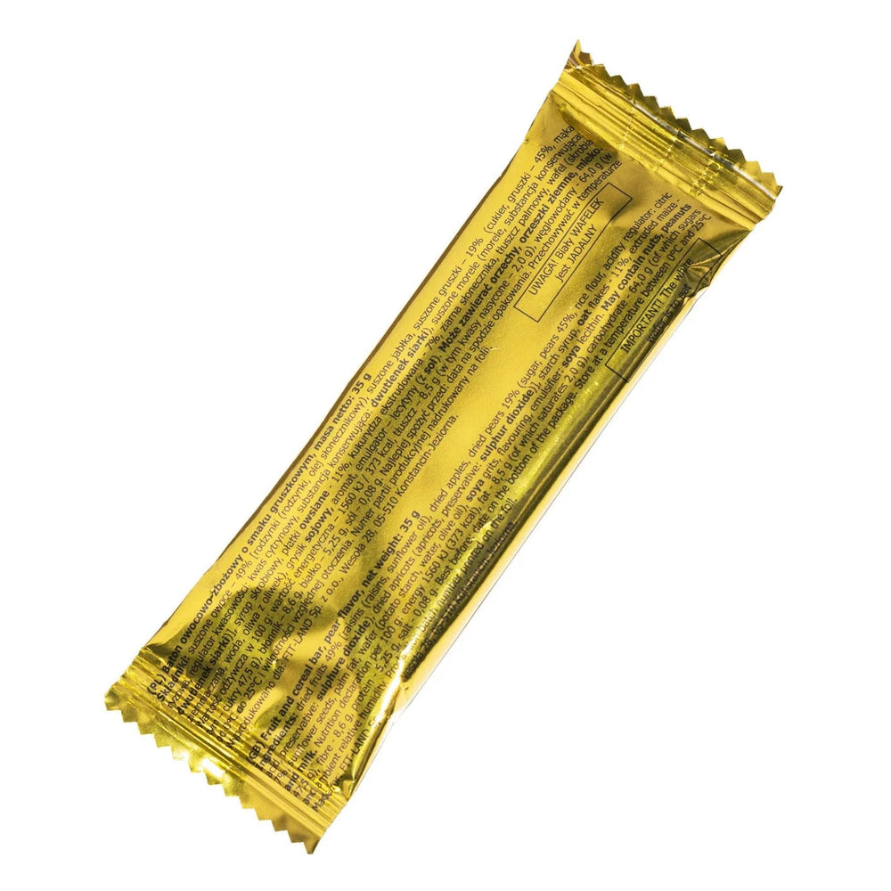 Baton świetnie sprawdza się w pracy, szkole, podczas podróży czy aktywności na świeżym powietrzu. Wchodzi w skład polskiej wojskowej racji żywnościowej, co potwierdza jego wysoką wartość odżywczą i niezawodność w wymagających warunkach. Kompaktowa forma sprawia, że można go zabrać wszędzie – do pracy, szkoły, na spacer czy w podróż – i cieszyć się zdrową przekąską w dowolnym momencie dnia. Trwałość, zwarta budowa i wysoka wartość odżywcza powodują, że baton owocowo‑zbożowy o smaku gruszkowym świetnie sprawdza się w warunkach wymagających niezawodnego źródła energii – od długich wędrówek górskich, przez wyprawy rowerowe, po element polskiej wojskowej racji żywnościowej. Odporność na uszkodzenia mechaniczne i łatwość przechowywania sprawiają, że jest praktycznym wyborem w plecaku podróżnika, w ekwipunku survivalowym czy w zestawie prowiantowym na rejsy i spływy kajakowe.