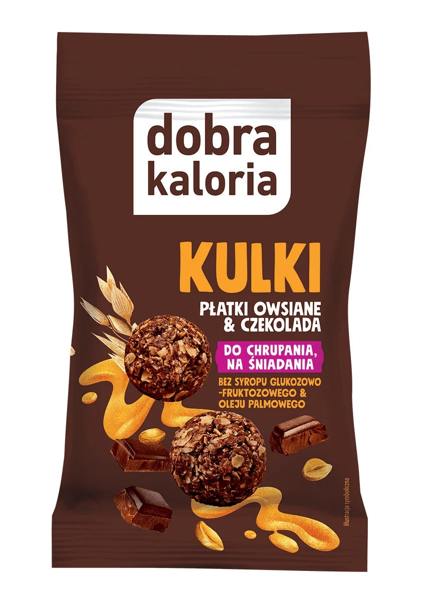 Kulki śniadaniowe Dobra Kaloria Płatki Owsiane i Belgijska Czekolada to chrupiąca przekąska z prostego składu. Produkt powstaje z polskiego owsa, miazgi z prażonych orzeszków ziemnych, miodu i belgijskiej gorzkiej czekolady. Charakteryzuje się prostym składem, brakiem oleju palmowego i syropu glukozowo-fruktozowego. Kulki mają wysoką zawartość błonnika, co czyni je sycącą przekąską na różne okazje.