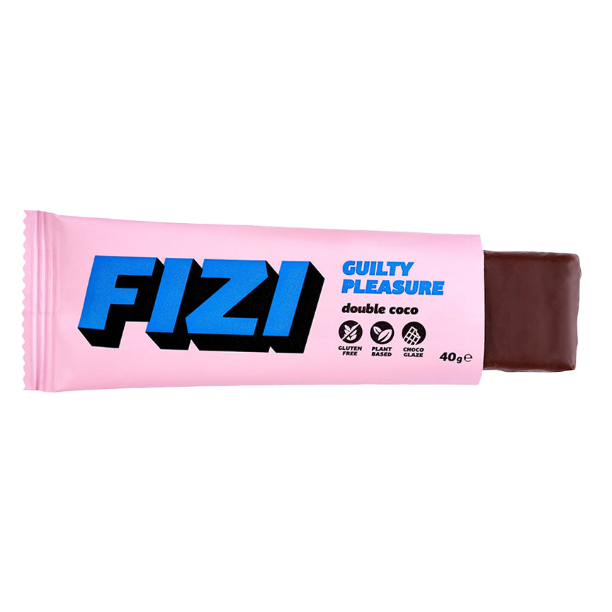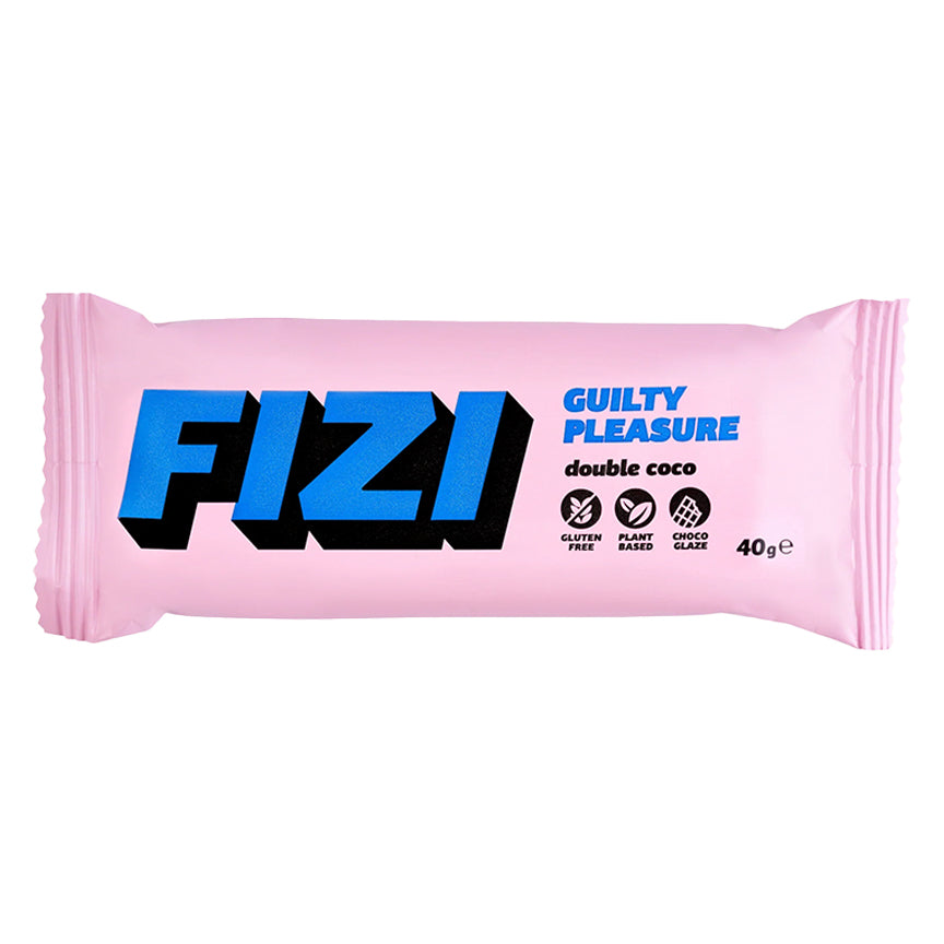 FIZI Baton bezglutenowy Double Coco to połączenie wiórków kokosowych z koncentratem soku jabłkowego, pokryte polewą czekoladową. Baton charakteryzuje się wysoką zawartością błonnika, ma bardzo niską zawartość soli oraz nie zawiera dodatku białego cukru. Produkt jest bez oleju palmowego, bez soji i non-GMO. Baton jest wegański i bezglutenowy, co potwierdzają certyfikaty Vegan Society i Gluten-Free.