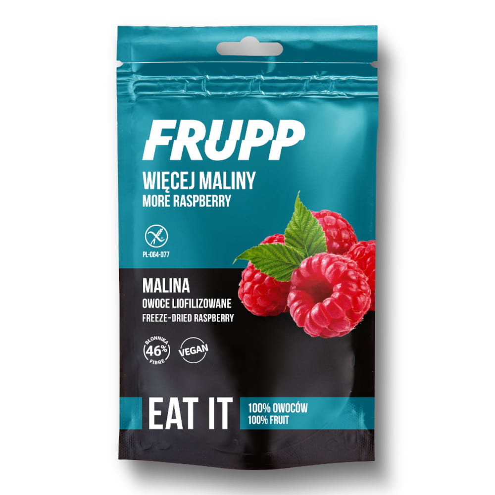 FRUPP Malina to liofilizowane owoce, które w 100% składają się z maliny. Proces liofilizacji polega na suszeniu próżniowym w bardzo niskiej temperaturze, dzięki czemu owoce zachowują swój naturalny smak, aromat oraz wartości odżywcze. Produkt jest bez dodatku cukru i zawiera jedynie naturalnie występujące cukry. To chrupiąca, lekka przekąska w wygodnym, małym opakowaniu 15 g. Zawiera naturalnie występujące cukry.