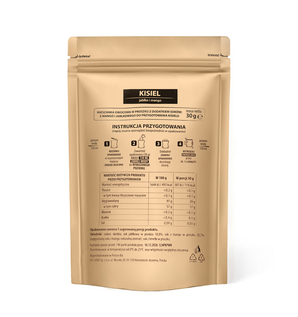 Kisiel jabłko i mango 30 g to deser instant łączący smak soczystych jabłek z egzotycznym mango. Zawiera 20,7% soku z mango w proszku oraz 18,8% soku jabłkowego w proszku. Prosty w przygotowaniu – wystarczy dodać 150 ml ciepłej lub zimnej wody. Produkt charakteryzuje się niską zawartością tłuszczu (<0,2 g/100 g) oraz niską zawartością soli (0,09 g/100 g).